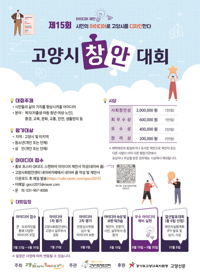 아이디어를 응모하고 싶은 시민은 홍보포스터의 QR코드로 제안서를 작성하거나 고양사회창안센터 이메일로 접수하면 된다. 제안서 서식은 고양사회창안센터 카페에서 다운받을 수 있다. 자세한 문의는 고양사회창안센터로 하면 된다.