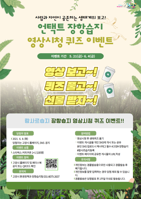 참여 방법은 고양시 홈페이지 또는 페이스북에 접속해 장항습지 영상을 시청한 후 생태퀴즈를 풀고 게시물을 개인 SNS에 공유한 후 공유 URL을 제출하면 된다. 내달 8일에 당첨자를 발표하며, 당첨자 100명에게는 커피 쿠폰을 제공한다.