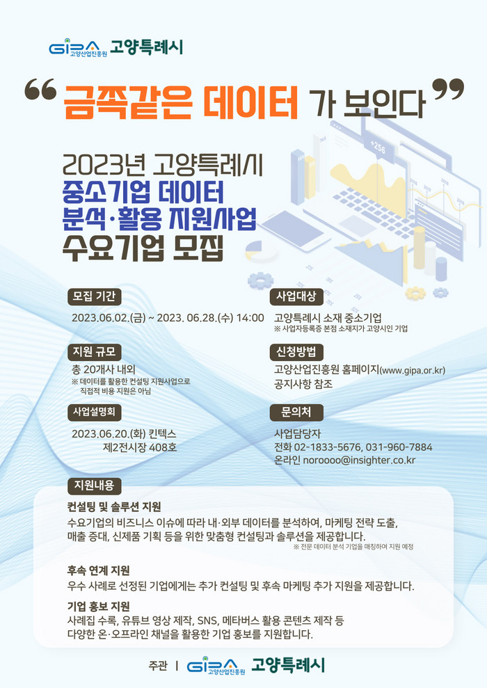 [부자동네타임즈 김인수기자] 고양특례시(시장 이동환)와 고양산업진흥원(원장 오창희, 이하 진흥원)은 6월 28일(수)까지 2023년 중소기업 데이터 분석·활용 지원사업'에 참여할 중소기업을 모집한다.