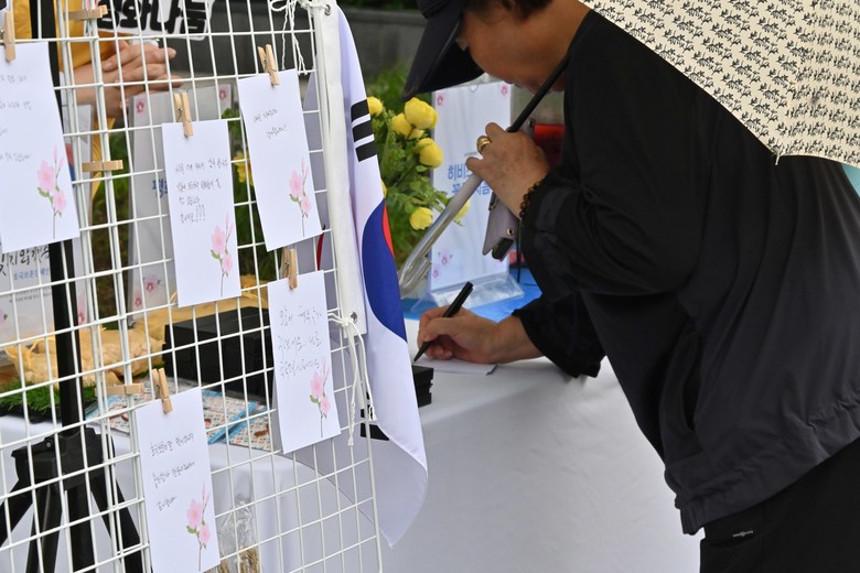 | ▲ 21일 보라매공원 인근에서 열린 ‘나라 사랑 평화 나눔 캠페인’이 열린 가운데 한 시민이 평화 메시지를 작성하고 있다. [사진 제공 = 신천지자원봉사단 동작지부] |