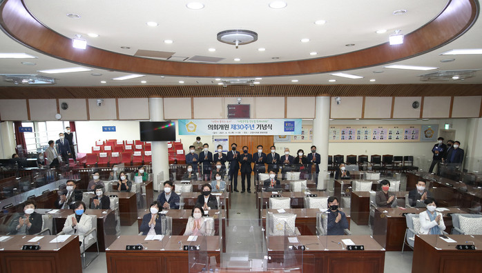 이번 행사는 코로나19 사회적 거리두기 방역지침을 준수하여 1991년 제1대 의회 개원부터 현재까지의 의회 변천사 홍보 영상 상영과 기념촬영의 순으로 간소하게 진행됐다.