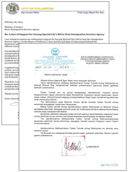 시에 따르면 풀러턴시와 돈드고비 아이막은 최근 서한문을 통해 고양시의 이민관리청 유치 활동에 전폭적인 지지를 전한다고 밝혔다.