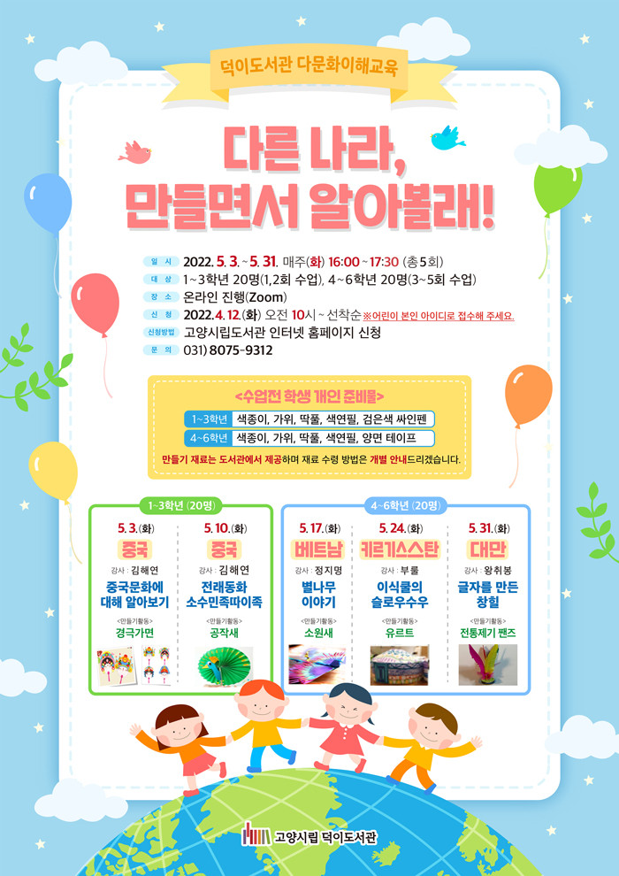 [부자동네타임즈 김인수기자] 고양시 덕이도서관이 어린이를 위한 다문화 이해 프로그램 다른나라, 만들면서 알아볼래!를 5월 3일부터 5월 31일까지 매주 화요일(16:00~17:30) 총 5회에 걸쳐 운영한다.