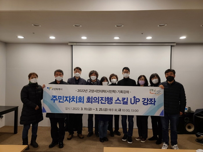 [부자동네타임즈 김인수기자] 고양시가 고양시 주민자치회 위원들 대상으로 2022년 고양시민대학 시민학 기획강좌 ‘주민자치회 회의진행 스킬 UP 강좌’를 3월 11일(금)부터 오는 25일(금)까지 실시한다.