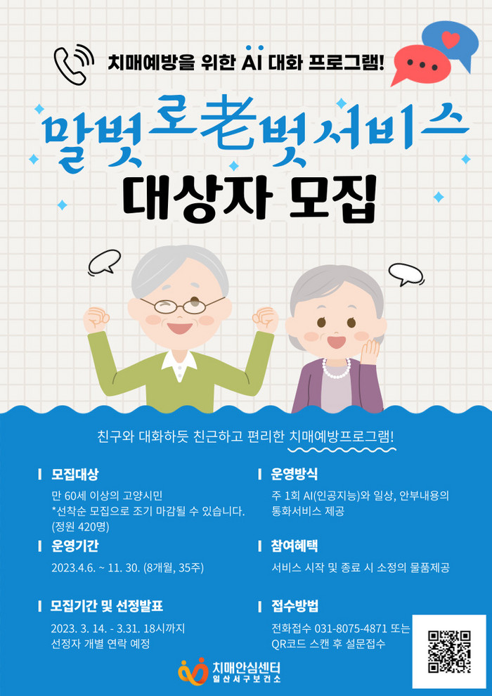 [부자동네타임즈 김인수기자] 고양특례시(시장 이동환) 일산서구보건소는 ‘AI 말벗 로(老)벗 서비스’에 참여할 프로그램 대상자를 3월 31일까지 모집한다고 밝혔다.