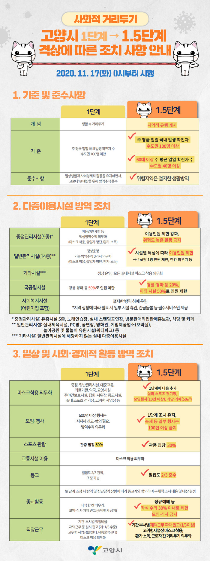 1.5단계 발령에 따라 고양시 내 결혼식장·장례식장·목욕장업, 오락실·멀티방, 실내체육시설 등에서 시설면적 4㎡당 1명으로 이용인원이 제한되며, 영화관, 공연장, PC방에서는 다른 일행 간 좌석띄우기 등이 추가로 실시된다.