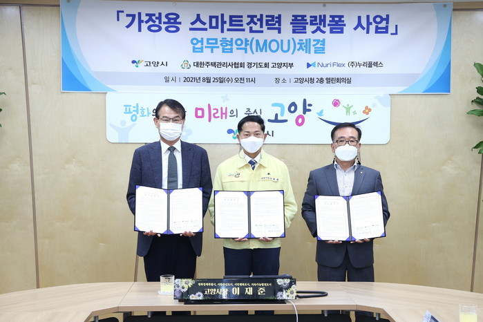 [부자동네타임즈 김인수기자] 고양시가 25일 고양시청 열린회의실에서 대한주택관리사협회 경기도회 고양지부(지부장 이명찬), ㈜누리플렉스(대표이사 김영덕)와 고양시 관내 공동주택의 기존 기계식 또는 전자식 전력계량기를 지능형 전력계량 시스템로 교체하는 ‘가정용 스마트전력 플랫폼 사업’업무 협약을 체결했다.