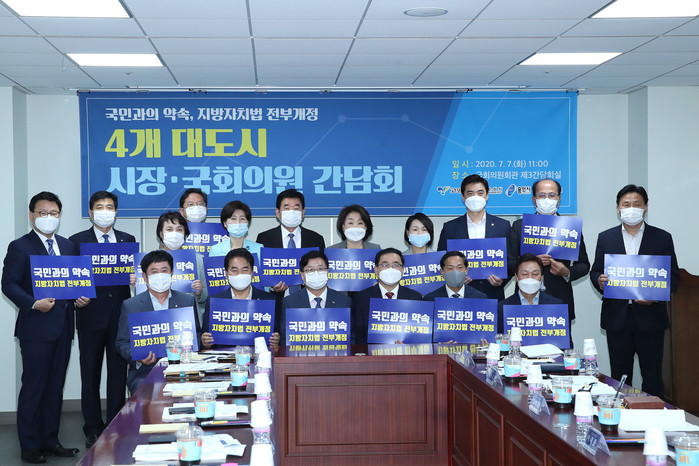[부자동네타임즈 김인수기자] 고양시 시장 이재준를 비롯한 인구 100만 이상 4개 도시 시장과 국회의원들은 7월 7일 국회 의원회관에서 지방자치법 전부개정안의 조속한 국회 통과를 위한 대응방안을 모색했다.