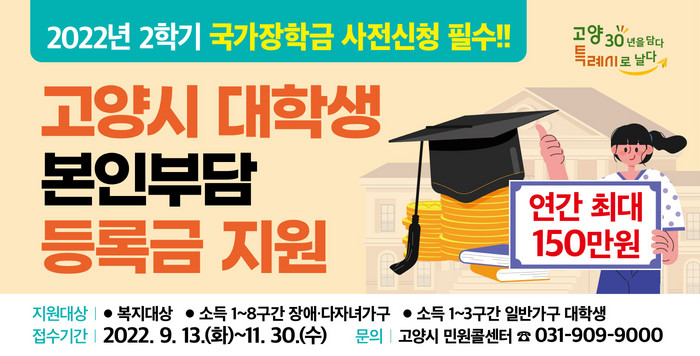 [부자동네타임즈 김인수기자] 고양특례시(시장 이동환)가 올해 9월 13일(화)부터 11월 30일(수)까지 2022년 2학기 대학생 본인부담등록금 지원 신청을 접수한다.