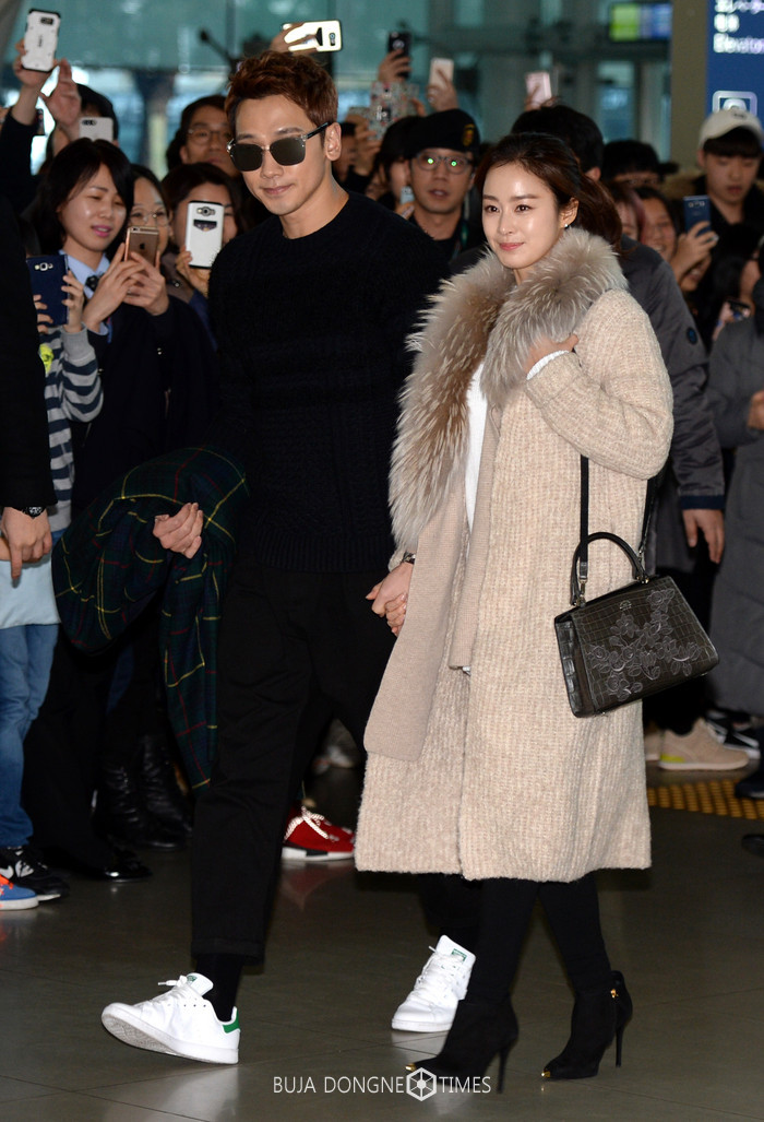 가수 비와 배우 김태희 부부가 지난 19일 서울 가회동 성당에서 혼배미사를 마치고 22일 오후 인천 국제공항을 통해 인도네시아 발리로 신혼여행을 떠나고 있다. 2017.01.22.
