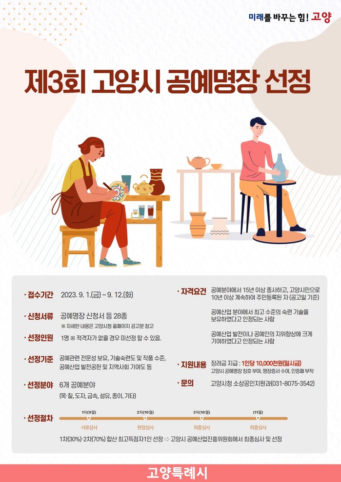 심사는 외부전문가에 의해 1차 서류심사와 2차 현장심사를 진행하며, 고양시 공예산업진흥위원회에서 최종 1명의 공예명장을 선정할 계획이다.