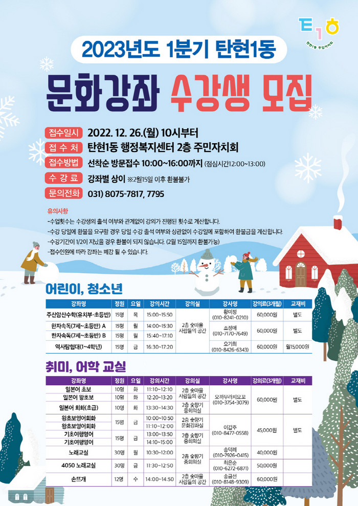 [부자동네타임즈 김인수기자] 고양특례시 탄현1동 주민자치회(회장 조경순)는 2023년 1분기(1월~3월) 주민자치센터 문화강좌 신규 수강생을 모집할 계획이라고 밝혔다.