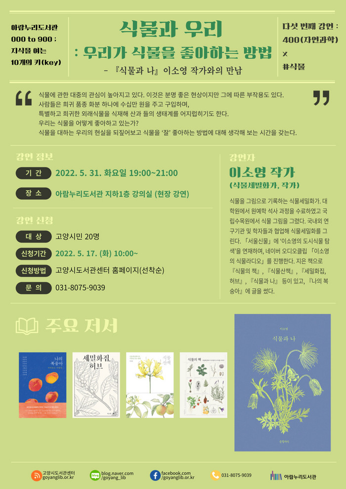 [부자동네타임즈 김인수기자] 고양시 아람누리도서관이 오는 5월 31일(화) 자연과학 분야의 독서문화프로그램 ‘식물과 우리: 우리가 식물을 좋아하는 방법’을 운영한다.