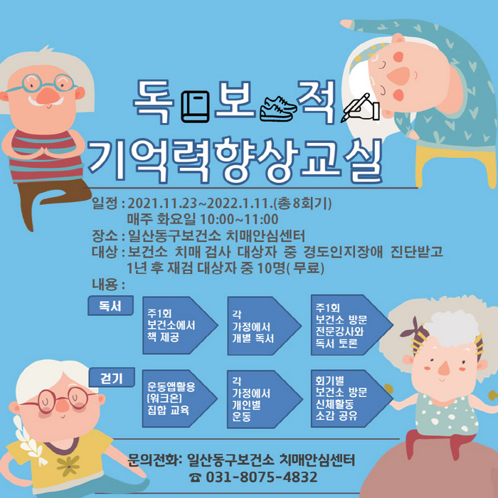 [부자동네타임즈 김인수기자] 고양시 일산동구보건소가 11월 23일부터 경도 인지장애 판정 대상자의 기억력 향상을 돕기 위해 ‘독보적 기억력향상교실’ 프로그램을 운영한다.