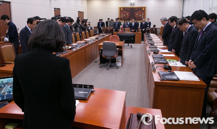 | △ 지난 17일 오후 서울 여의도 국회 외교통일위원회 회의실에서 열린 프랑스 파리 테러사태 관련 간담회에 참석한 여야 의원들과 임성남 외교부 1차관이 희생자들을 추모하는 묵념을 하고 있다. <사진제공=포커스뉴스> |
