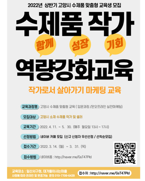 모집 대상은 고양시에 주민등록이 되어 있거나 사업장을 운영하는 수제품 작가 및 셀러이며, 3월 31일까지 온라인으로 신청하면 된다.