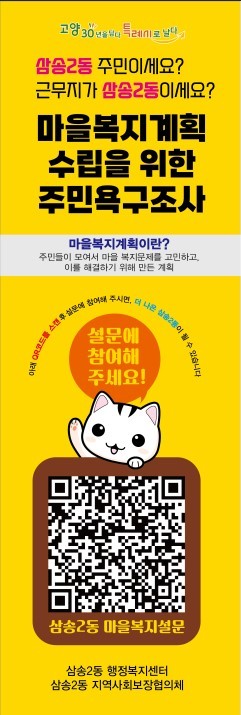 [부자동네타임즈 김인수기자] 고양시 삼송2동행정복지센터는 지역사회보장협의체에서 지난 23일부터 다음달 5일까지 삼송2동 마을복지계획 수립을 위한 설문조사를 실시한다고 밝혔다.