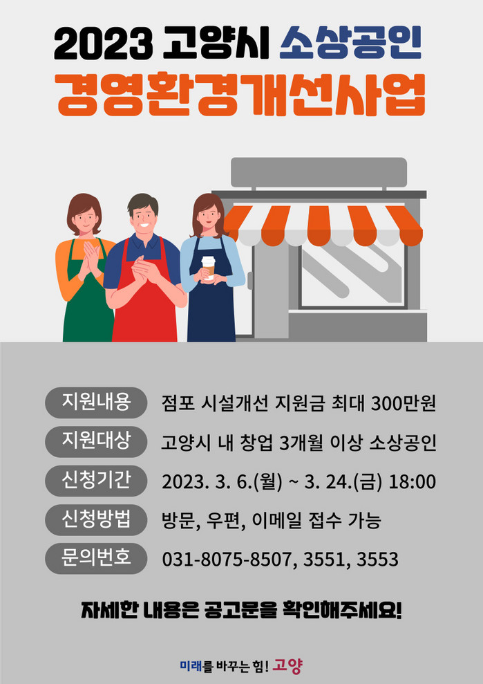 [부자동네타임즈 김인수기자] 고양특례시(시장 이동환)가 물가상승 및 경기 불황으로 경영에 어려움을 겪고 있는 소상공인을 지원한다. 시는 3월 24일까지 ‘2023년 고양시 소상공인 경영환경 개선사업’ 신청자를 모집한다고 밝혔다.