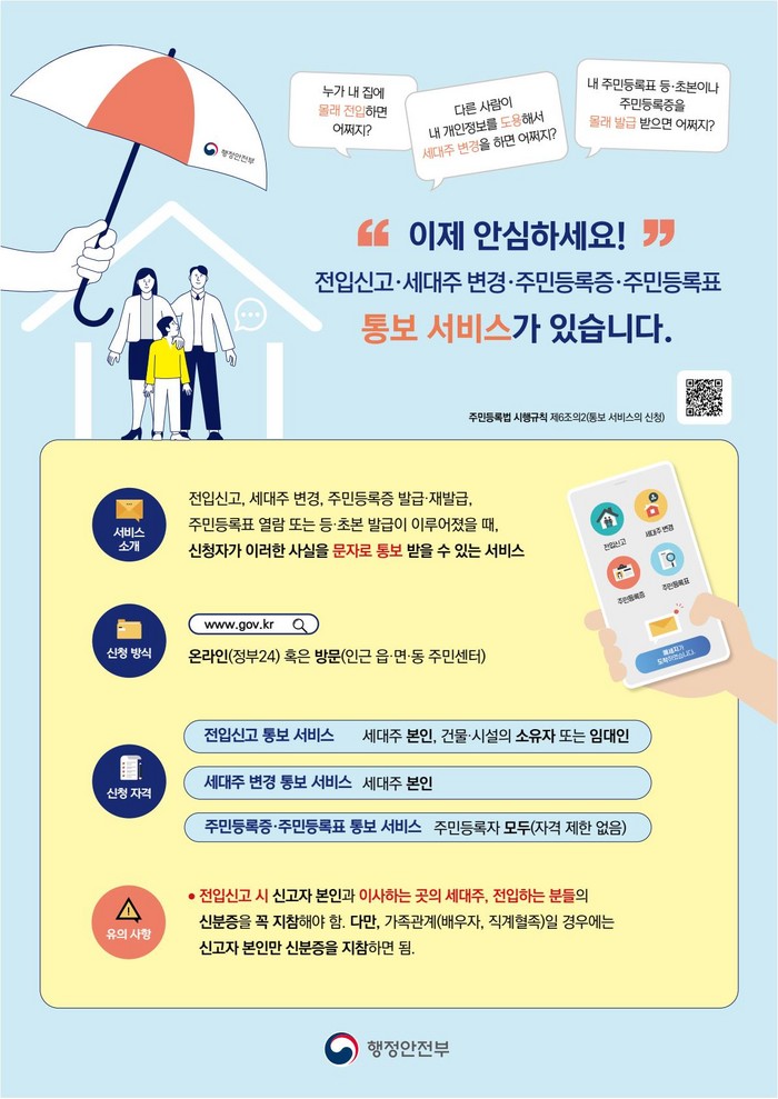또한, 자신의 거주지에 누군가 전입신고 했거나 세대주 지위 변경, 주민등록증 발급·재발급, 주민등록표 열람 또는 등·초본 발급이 이루어졌을 때, 이러한 사실을 문자로 통보 받을 수 있는 ▲전입신고 통보 서비스 ▲세대주변경 통보 서비스 ▲주민등록증·주민등록표 통보 서비스도 실시한다.