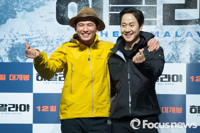 (서울=포커스뉴스) 9일 오전 서울 강남구 논현로 압구정 CGV에서 열린 영화 '히말라야' 제작보고회에 참석한 배우 황정민(왼쪽)과 정우가 포토타임을 갖고 있다.