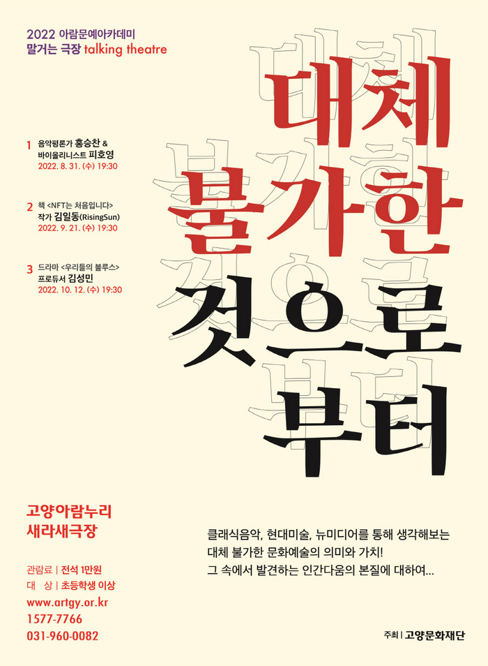 [부자동네타임즈 김인수기자] 블록체인과 NFT 등 문화예술의 대체 불가성과 고유성에 대한 관심이 높아진 요즘, 고양문화재단(대표이사 정재왈)이 극장형 예술인문학 프로그램 2022 아람문예아카데미 - 말거는 극장 : 대체 불가한 것으로부터를 통해 ‘대체 불가한 문화예술의 의미와 가치’, 그 속에서 발견하는 ‘인간의 특별함’과 ‘인간다움의 본질’에 대해 생각해보는 시간을 마련한다.