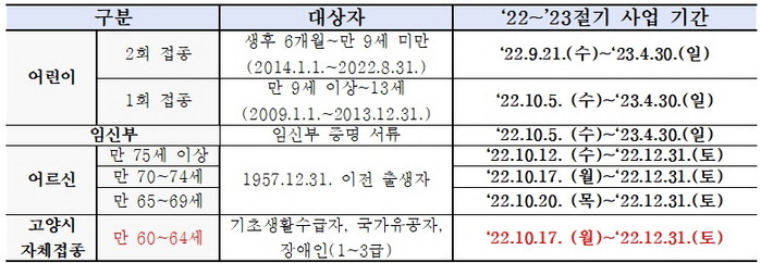 대상자별 접종일정(사진 참조) 및 고양시 지정 위탁의료기관은 고양시보건소 홈페이지, 예방접종 도우미 사이트에서 확인할 수 있다.
