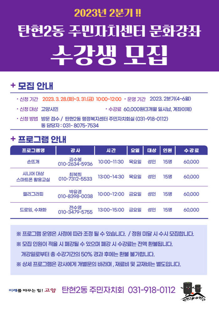 강좌는 2분기(4월 6일~6월 30일)동안 목요일, 금요일에 탄현2동 행정복지센터 대회의실에서 진행된다.