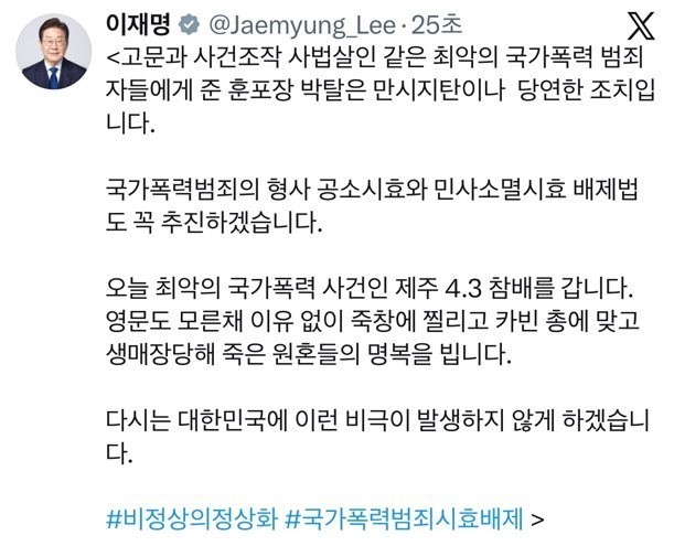 이재명 대통령은 29일 경찰이 과거 고문과 사건조작 등에 가담한 수사기관 관계자들이 받은 서훈에 대해 취소 조치에 착수한 것과 관련해 "사법살인 같은 최악의 국가폭력 범죄자에게 준 훈·포장 박탈은 만시지탄이나 당연한 조치"라고 말했다.이 대통령은 이날 엑스(X·옛 트위터)에 해당 내용이 담긴 기사를 링크하며 이같이 언급했다.특히 이 대통령은 "국가폭력범죄의 형사 공소시효와 민사소멸시효 배제법도 꼭 추진하겠다"고 약속했다.