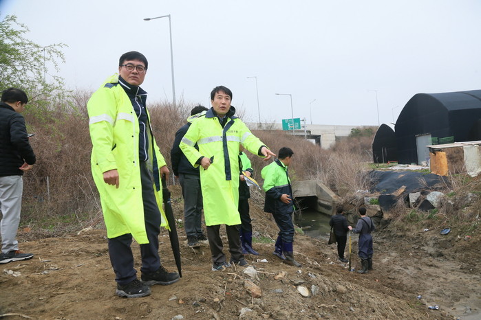 이번 점검은 덕양구 안전건설과와 서울문산고속도로(주) 시설관리팀이 합동으로 현장점검반을 구성하여, 강매IC 제2자유로 침수 우려 지역 배수로의 사전 준설작업 후 관리 실태 양호 여부를 확인하고 추가적인 안전대책 필요성을 강구했다.