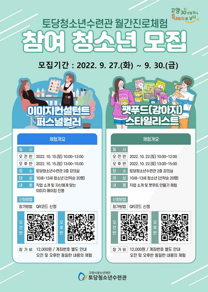 한편 월간진로 체험활동은 10세~13세 청소년을 대상으로 각 프로그램 별 20명씩 선착순 모집으로 진행되며 참가신청은 ▲이미지컨설턴트, 팻푸드 9월 27일부터 30일까지, ▲파티시에, 플라워디렉터 10월 25일부터 10월 29일까지 각각 진행된다. 신청방법은 QR코드로 접속하여 네이버폼으로 작성한 후 제출하면 된다.