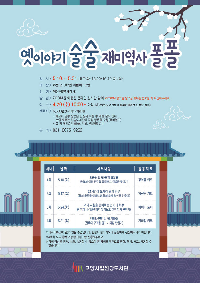 접수는 4월 20일(수) 오전 10시부터 고양시도서관센터 홈페이지에서 선착순으로 모집하며, 기타 자세한 사항은 원당도서관으로 문의하면 된다.