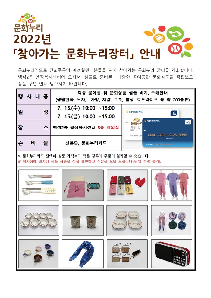 문화누리카드 가맹점에서 제작한 생활한복, 모자, 가방, 지갑, 그릇, 밥상, 효도라디오 등 각종 공예품과 문화상품 실물을 확인 후 구매를 원할 경우 주문을 진행할 수 있고, 이후 자택에서 배송 받아볼 수 있다.