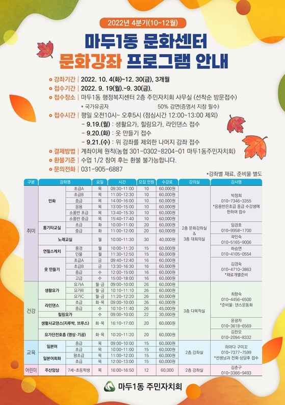 이번에 개설하는 강좌는 옷 만들기, 생활요가, 라인댄스, 민화, 노래교실 등 13개 분야 총 28개 강좌이며, 9월 19일부터 30일(10:00~17:00, 점심시간 12:00~13:00 제외)까지 마두1동 행정복지센터 2층 주민자치회 사무실에서 선착순으로 접수한다. 4분기 문화강좌 프로그램은 12월 30일까지 운영되며, 더 자세한 내용은 마두1동 행정복지센터 홈페이지 내 주민자치소식 및 센터 내 전단지를 통해 확인할 수 있다.
