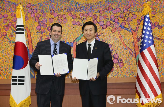 (서울=포커스뉴스) 윤병세 외교부 장관과 마크 리퍼트 주한 미국대사가 25일 서울 종로구 도렴동 외교부에서 열린 한미원자력협정 발효식에서 협정서를 교환하고 있다.
