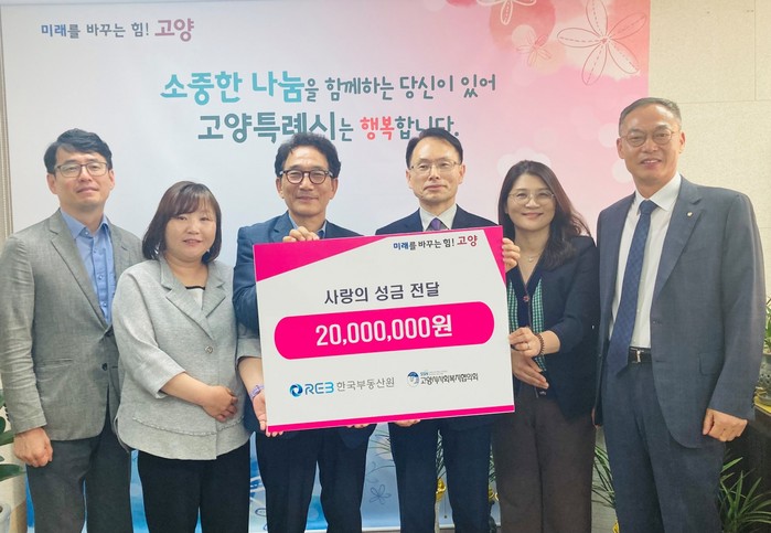 한국부동산원 권용수 수도권북부지역본부장과 강성덕 고양지사장은 “이웃과 사회를 돌아보고 나눔을 적극 실천하는 공공기관이 되고자 성금을 전달했다. 앞으로도 다양한 사회공헌사업을 실시해 지역사회 발전에 보탬이 되겠다.”고 말했다.