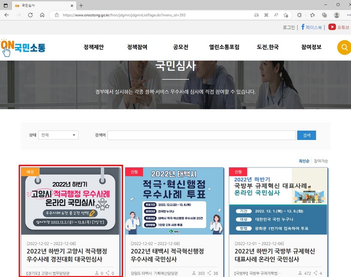 사전 온라인 국민심사는 ‘온국민소통’ 누리집의 국민심사 코너에서 12월 8일까지 진행된다.