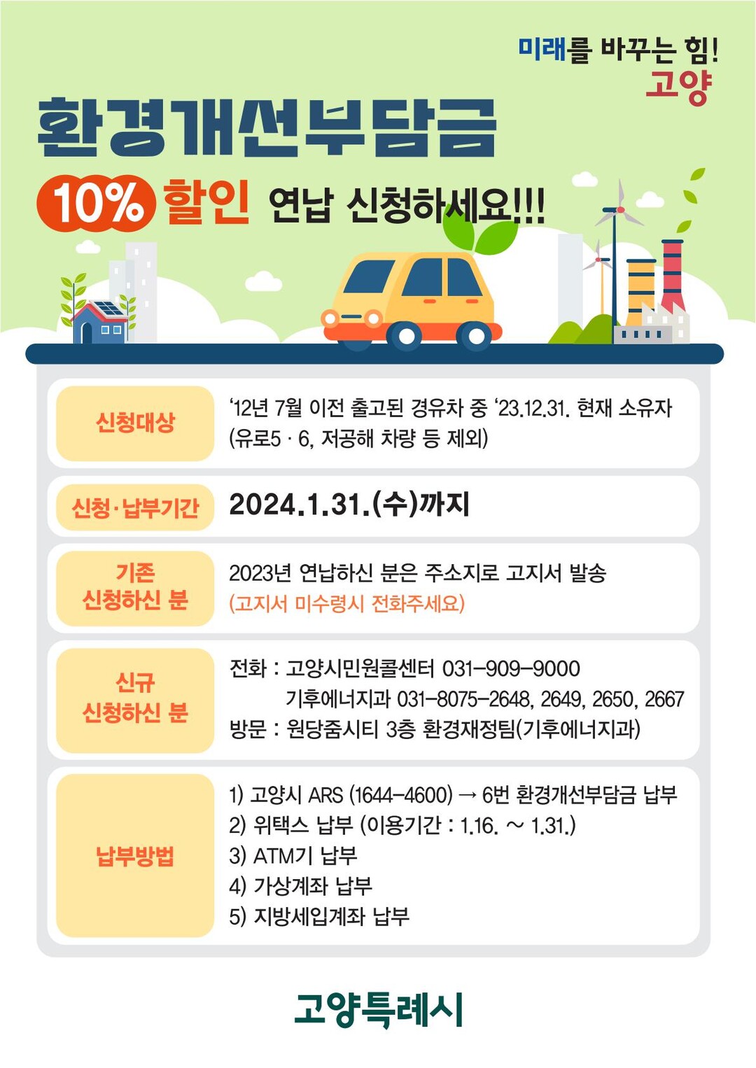 지난해 연납한 자동차 소유자는 별도의 신청 없이 올해도 연납 고지서를 받게 되며, 신규로 연납을 원한다면 2024년 1월 31일까지 고양시청 기후에너지과(031-8075-2648,2649,2650, 2667) 또는 고양시민원콜센터(031-909-9000)로 신청하면 된다.