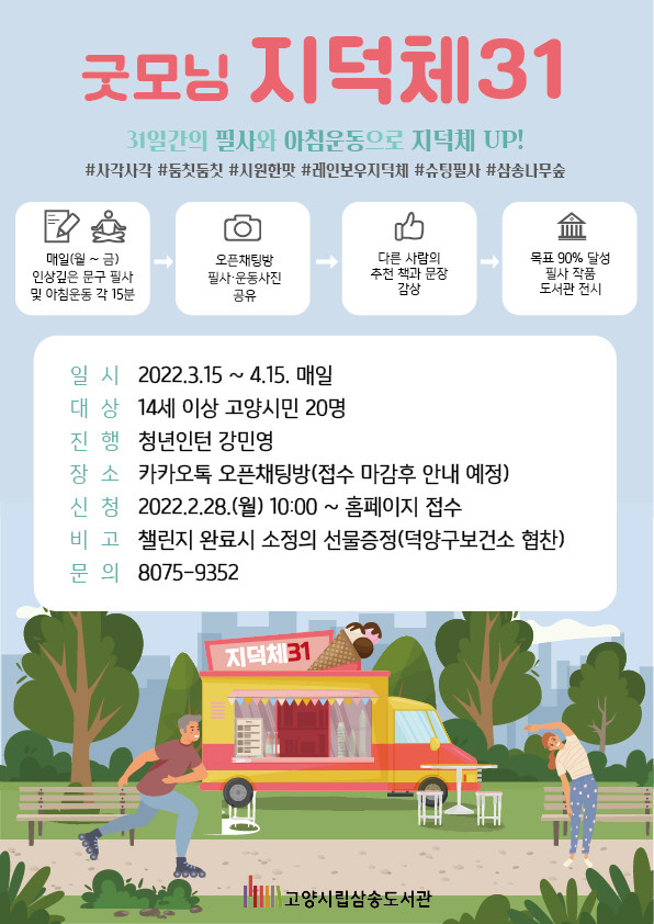 [부자동네타임즈 김인수기자] 고양시 삼송도서관이 덕양구보건소와 함께 3년째 진행하고 있는 미라클 모닝 프로젝트 ‘굿모닝 지덕체31’ 프로그램을 3월 15일부터 4월 15일까지 운영한다.