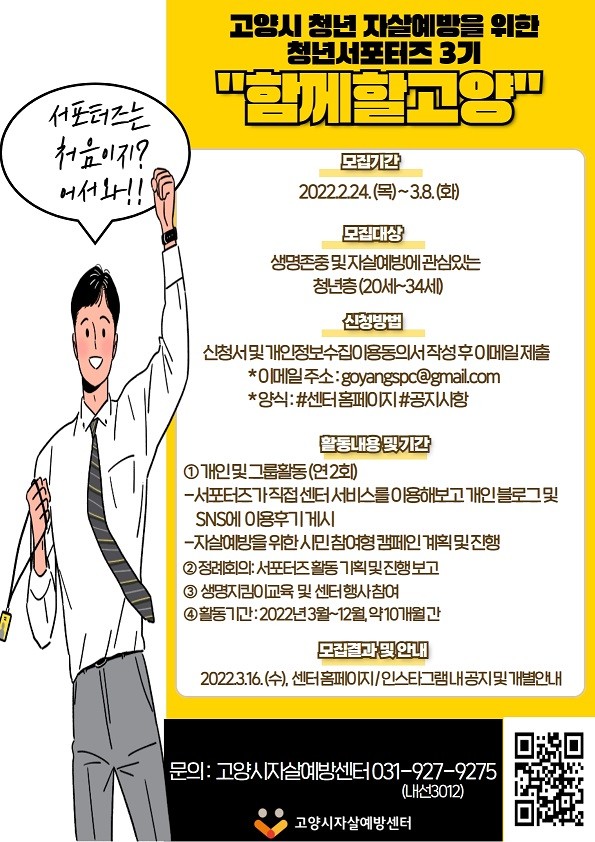 [부자동네타임즈 김인수기자] 고양시자살예방센터에서 청년층의 생명존중 및 자살예방에 대한 관심을 도모하고 올바른 인식을 가질 수 있도록 활동할 청년서포터즈 3기 함께할고양을 2월 24일부터 3월 8일까지 모집한다.