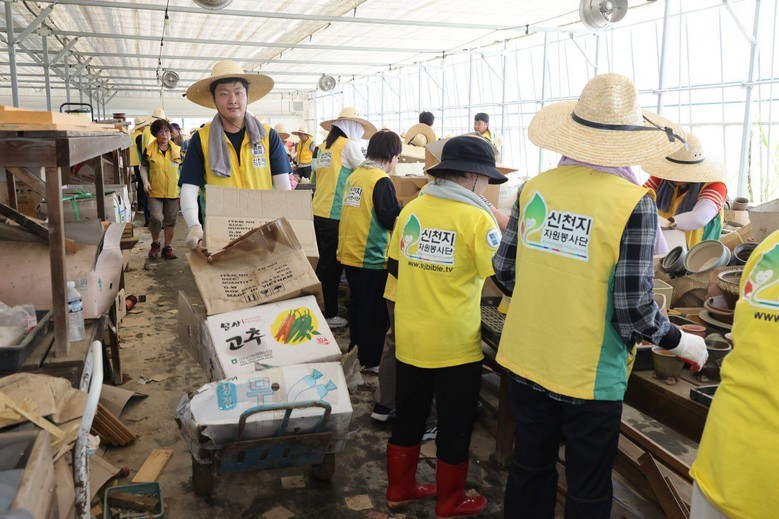 지난해 7월 광주 소재 한 다육식물 농장에서 신천지자원봉사단 전북지역연합회가 복구 작업을 하고 있다.