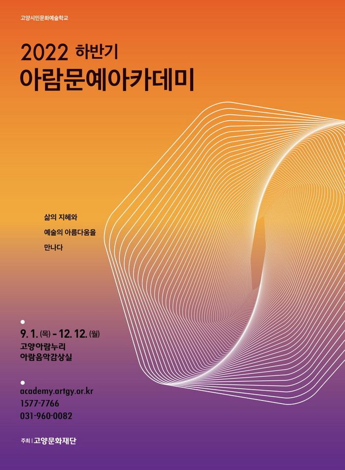 [부자동네타임즈 김인수기자] 고양문화재단(대표이사 정재왈)은 고양아람누리 문화예술교육 프로그램 <2022 하반기 아람문예아카데미>를 9월 1일 목요일부터 12월 12일 월요일까지 12주간 진행한다. 총 11개의 프로그램을 마련한 이번 하반기에는 사진, 건축, 연극 등 신규 장르도 신설하여 수강생들에게 더욱 풍성하게 다가갈 예정이다.