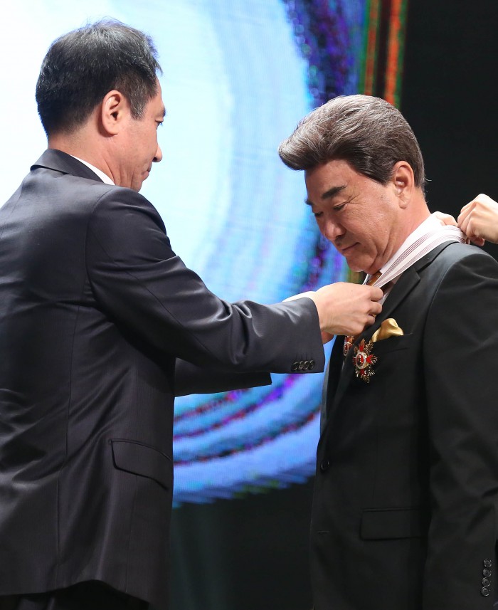 | △ 배우 이덕화가 29일 오후 2시 국립극장 해오름극장에서 열린 '2015 대한민국 대중문화예술상' 시상식에서 은관문화훈장을 수상하고 있다. <사진제공=문화체육관광부> |