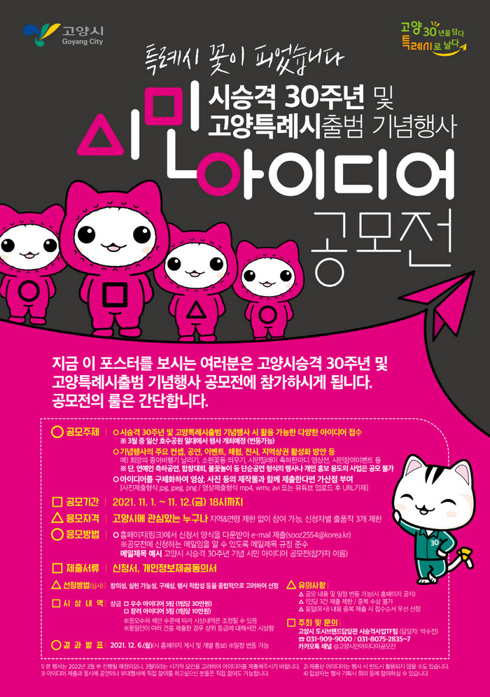 [부자동네타임즈 김인수기자] 고양시가 2022년 고양시 시승격 30주년 및 고양특례시 원년을 맞이해 ‘시승격 30주년 및 특례시 원년 기념행사 아이디어 공모전’을 개최한다.