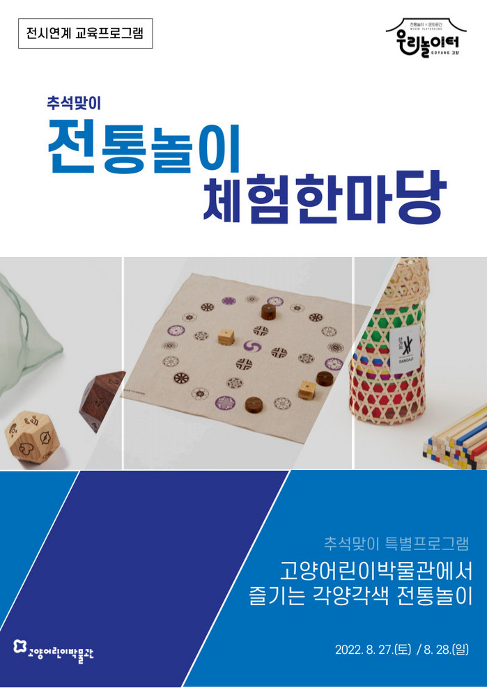 [부자동네타임즈 김인수기자] 고양특례시(시장 이동환) 산하 고양어린이박물관이 추석 시즌을 맞아 어린이들과 가족을 대상으로 8월 27일(토)부터 28일(일) 이틀간 총 4회에 걸쳐 <전통놀이 체험한마당>을 운영한다.