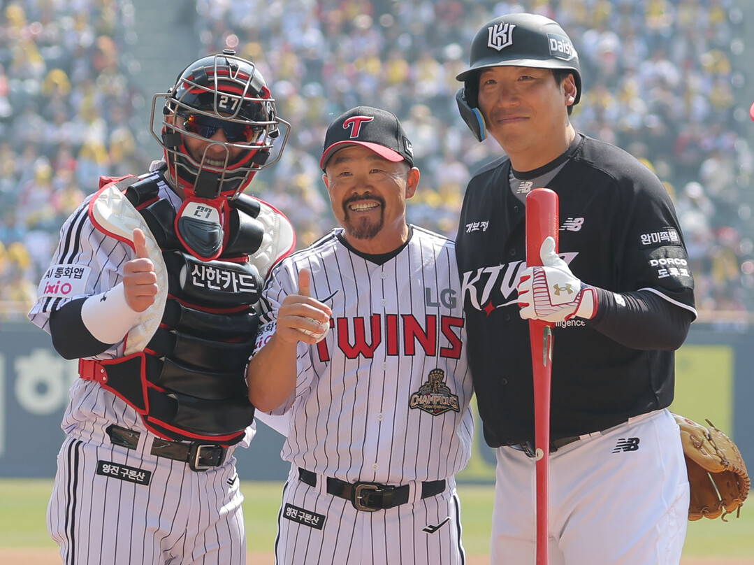 [부자동네타임즈 = 이언금 기자] 프로야구 정규시즌 개막일인 28일 서울 잠실야구장에서 열린 KT 위즈와 LG 트윈스의 경기에서 LG 김용일 수석트레이닝 코치가 시구를 마친 뒤 박동원, KT 김현수와 기념촬영을 하고 있다. 2026.3.28