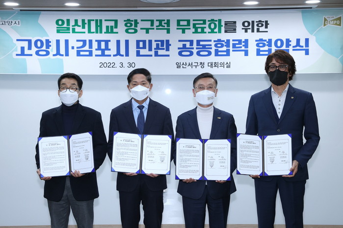 [부자동네타임즈 김인수기자] 고양시가 지난 30일 김포시(시장 정하영), 고양시일산대교무료화범시민추진위원회(위원장 김천만), 김포금빛누리시민연합회, 김포검단시민연대, 김포원도심총연합회, 김포수변단지연합회(고문 홍용운)와 일산대교 항구적 무료화를 위한 민관 공동협력 협약을 체결했다.