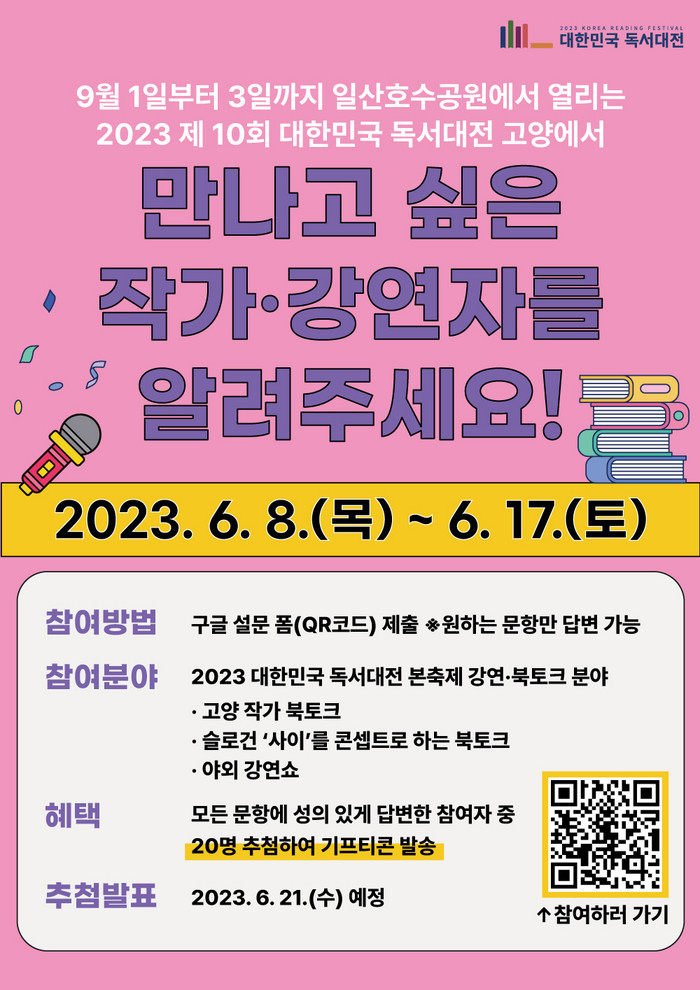이번 설문조사는 9월 1일부터 3일까지 열리는 전국 최대 규모의 독서문화축제인 ‘2023 대한민국 독서대전’에서 만나고 싶은 작가 및 강연자를 국민이 제안할 수 있는 기회를 제공하기 위해 마련하였다.