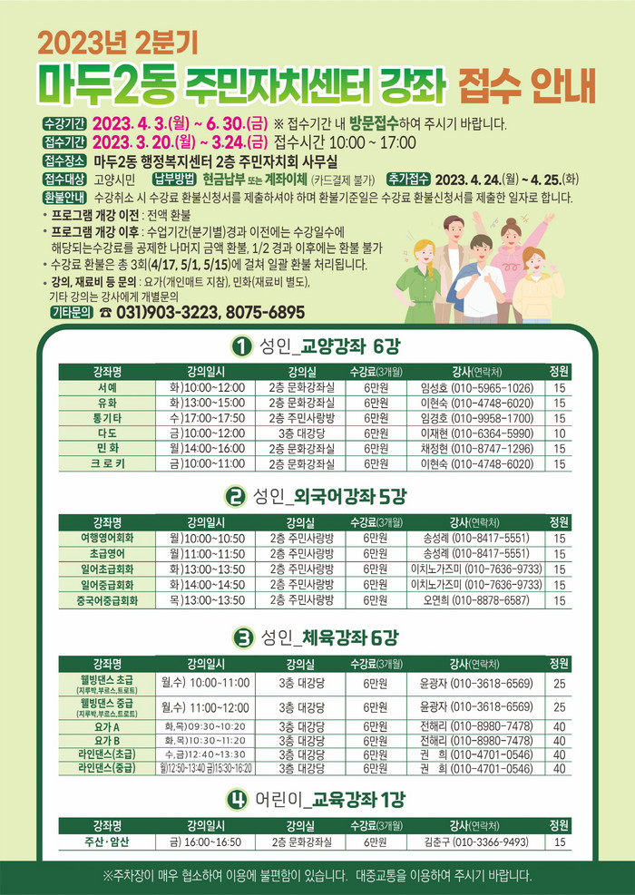 신규로 웰빙댄스, 크로키 강좌도 추가되어 주민들의 많은 관심을 받고 있다. 이번 강좌는 4월 3일부터 6월 30일까지 운영 할 예정이다.
