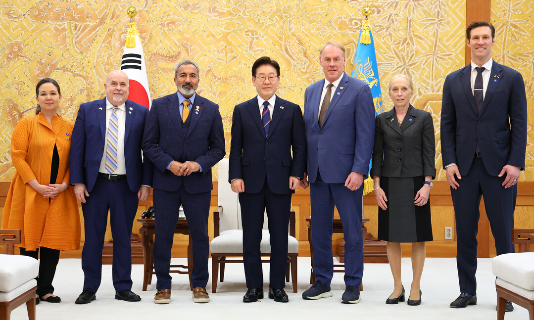 왼쪽부터 질 토쿠다, 마크 포칸, 아미 베라, 이 대통령, 라이언 징키, 메리 스캔런, 팻 해리건. 2026.3.31