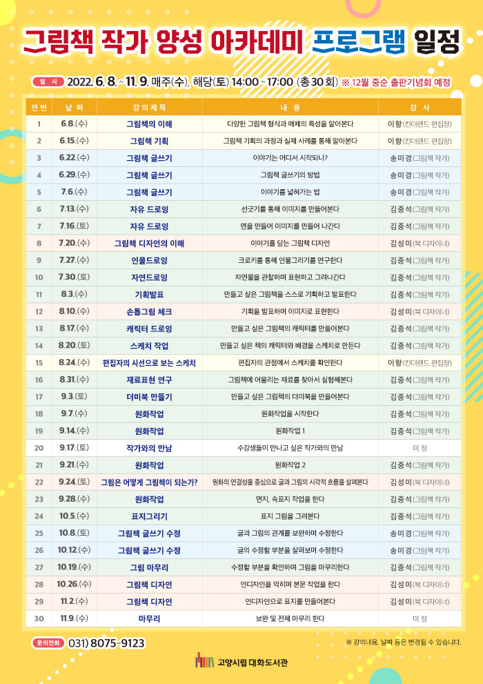 [부자동네타임즈 김인수기자] 고양시 대화도서관이 오는 6월부터 그림책 작가로 꿈을 키우고 발전시킬 수 있도록 지원하는 그림책 작가 양성 아카데미를 운영한다.